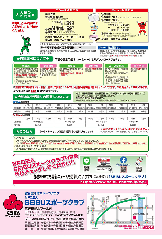 NPO法人SEIBUスポーツクラブ事務局(砺波市温水プール内)にて受付けています。